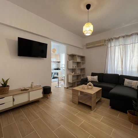 Happy is 43 square meters, located on the first floor of the building on Asklepiou Street. It can accommodate up to two people, has a double bed, desk, fully equipped kitchen,bathroom with waterfall shower, and a separate lounge aera.